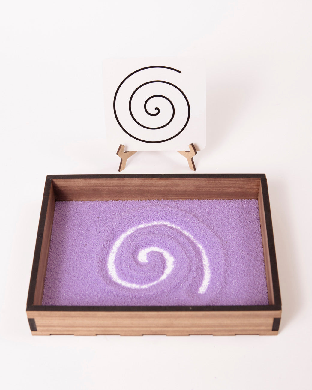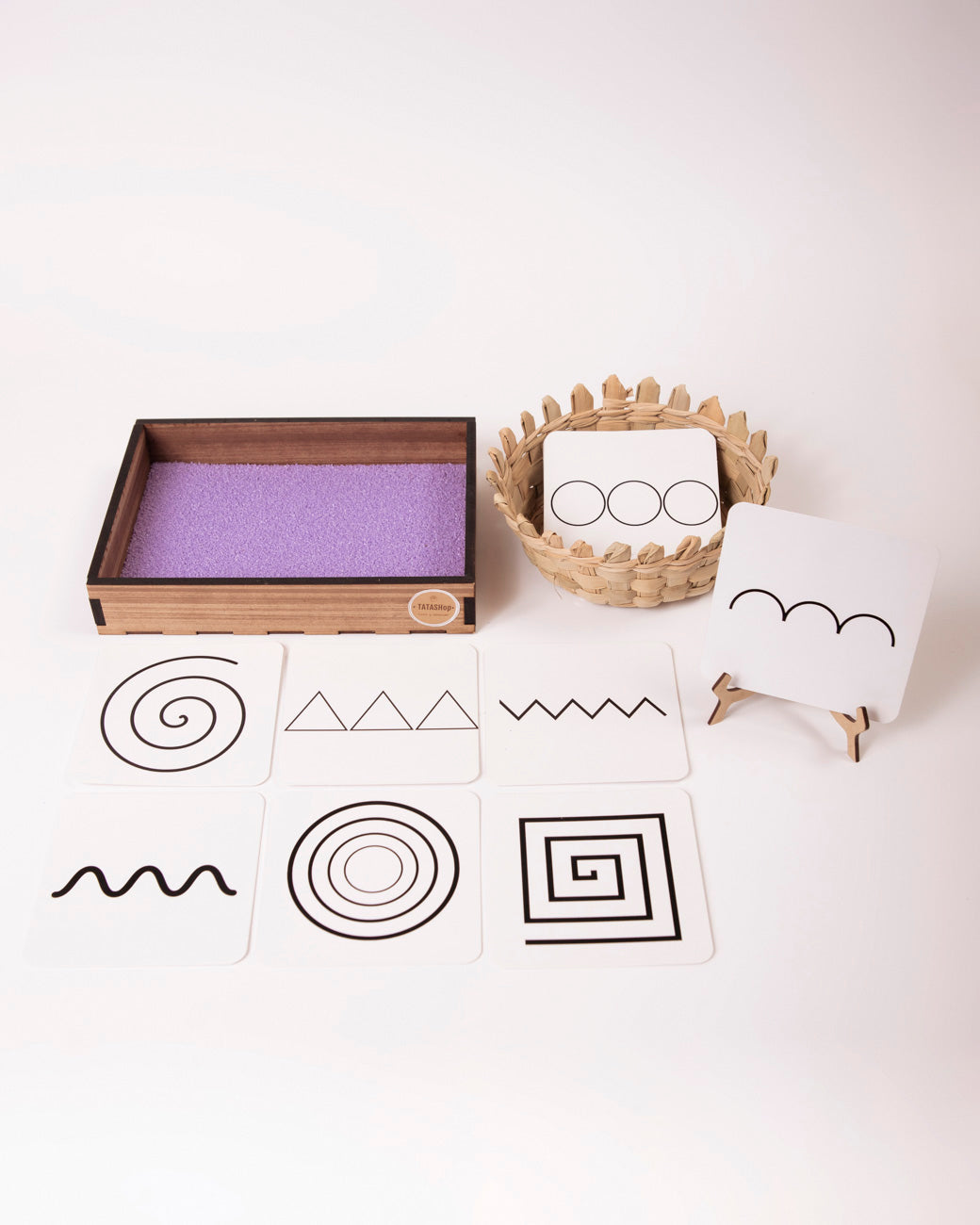 Gracias a la fina textura de nuestra arena y al ser un material natural, será toda una experiencia trazar las diferentes grafías que lo prepararán para la escritura.