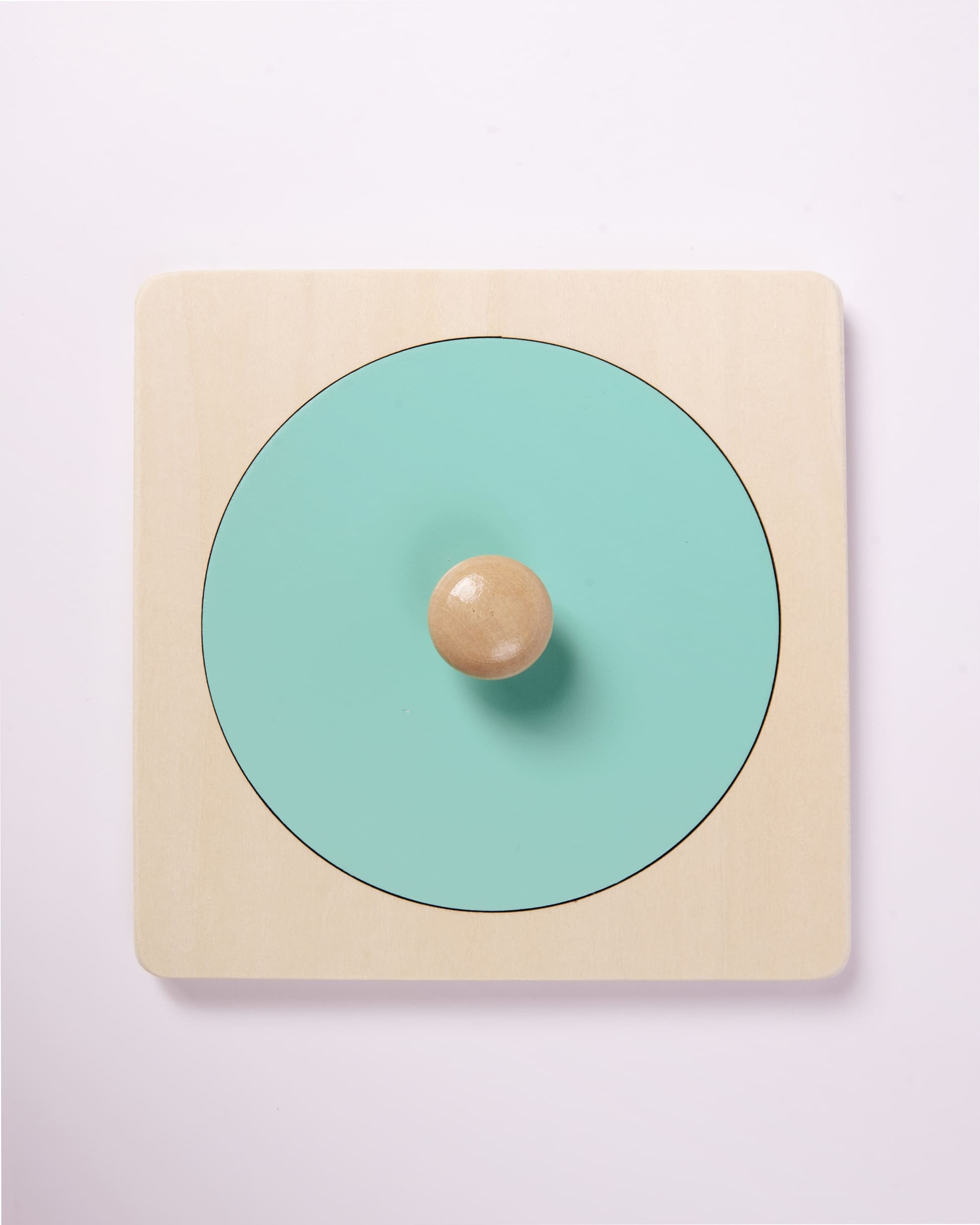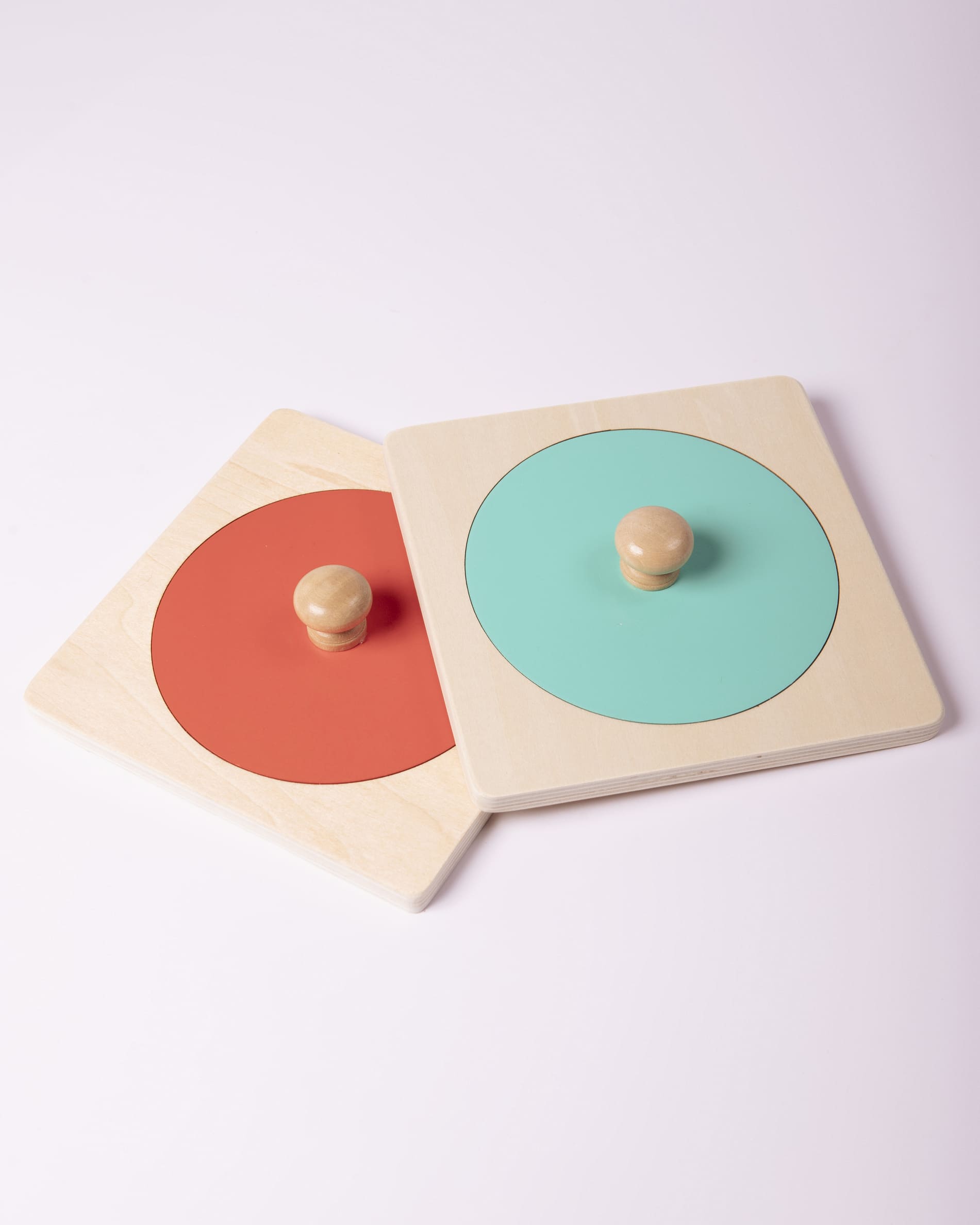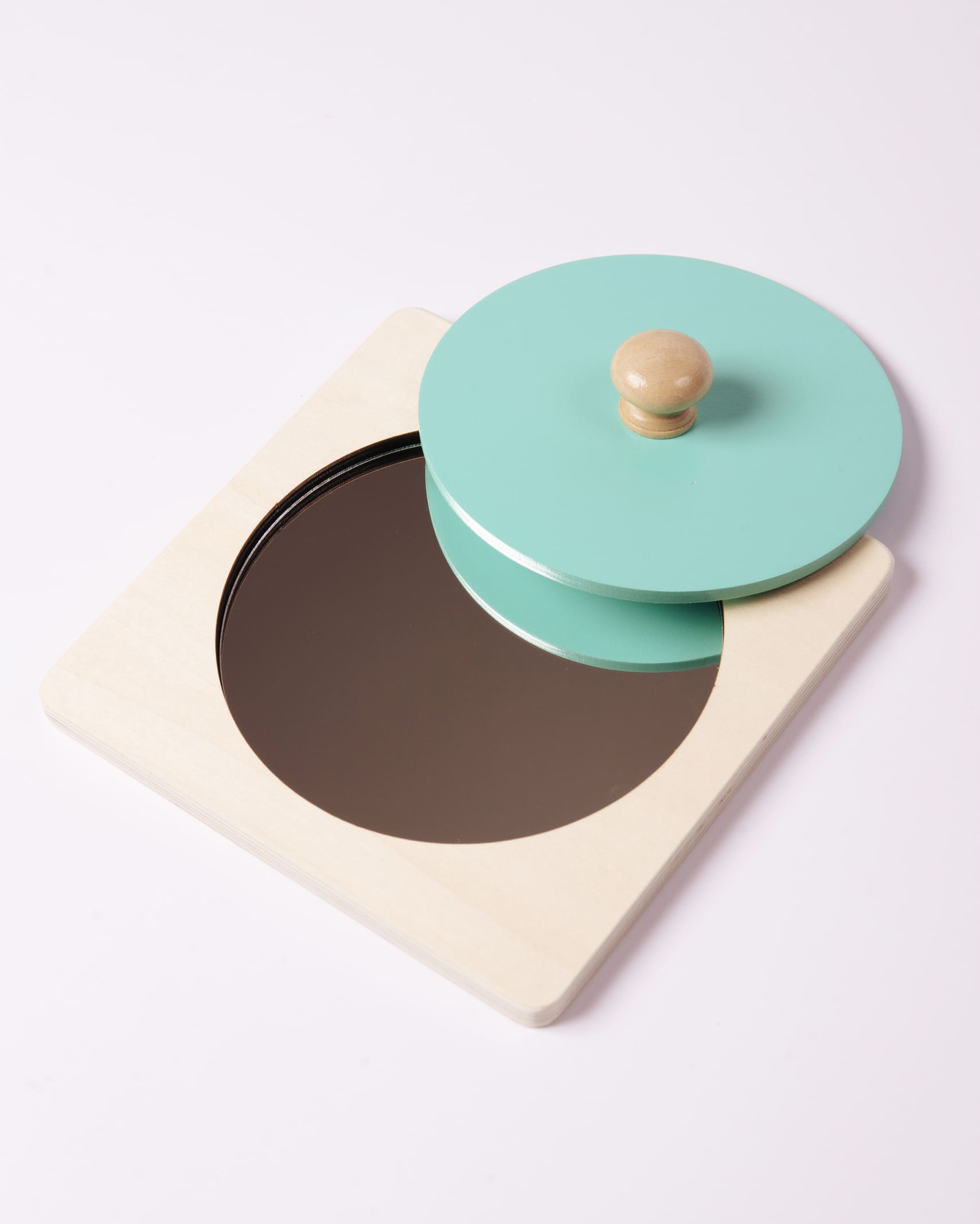 Muy bonito rompecabezas de pinza en forma de circulo, color rojo o turquesa con espejito.