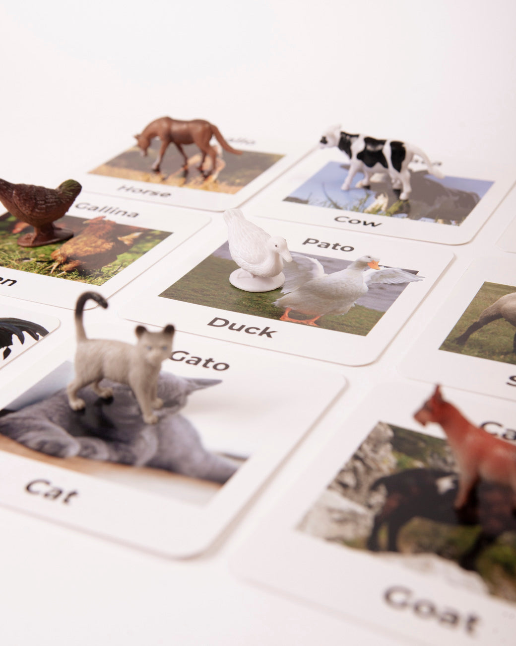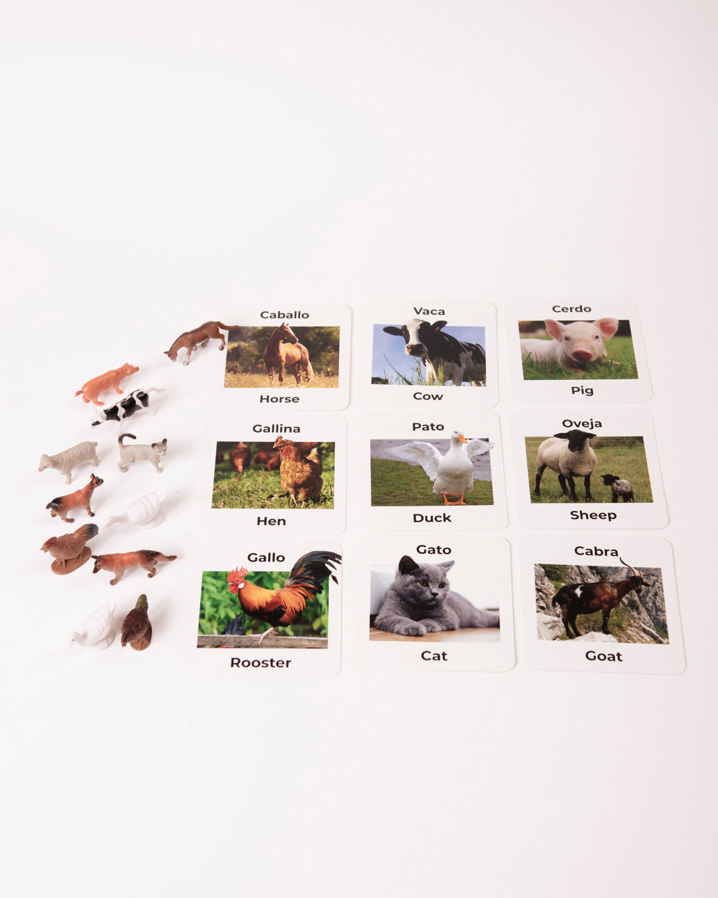12 Piezas de animales de Granja realistas con nombres en español e inglés.