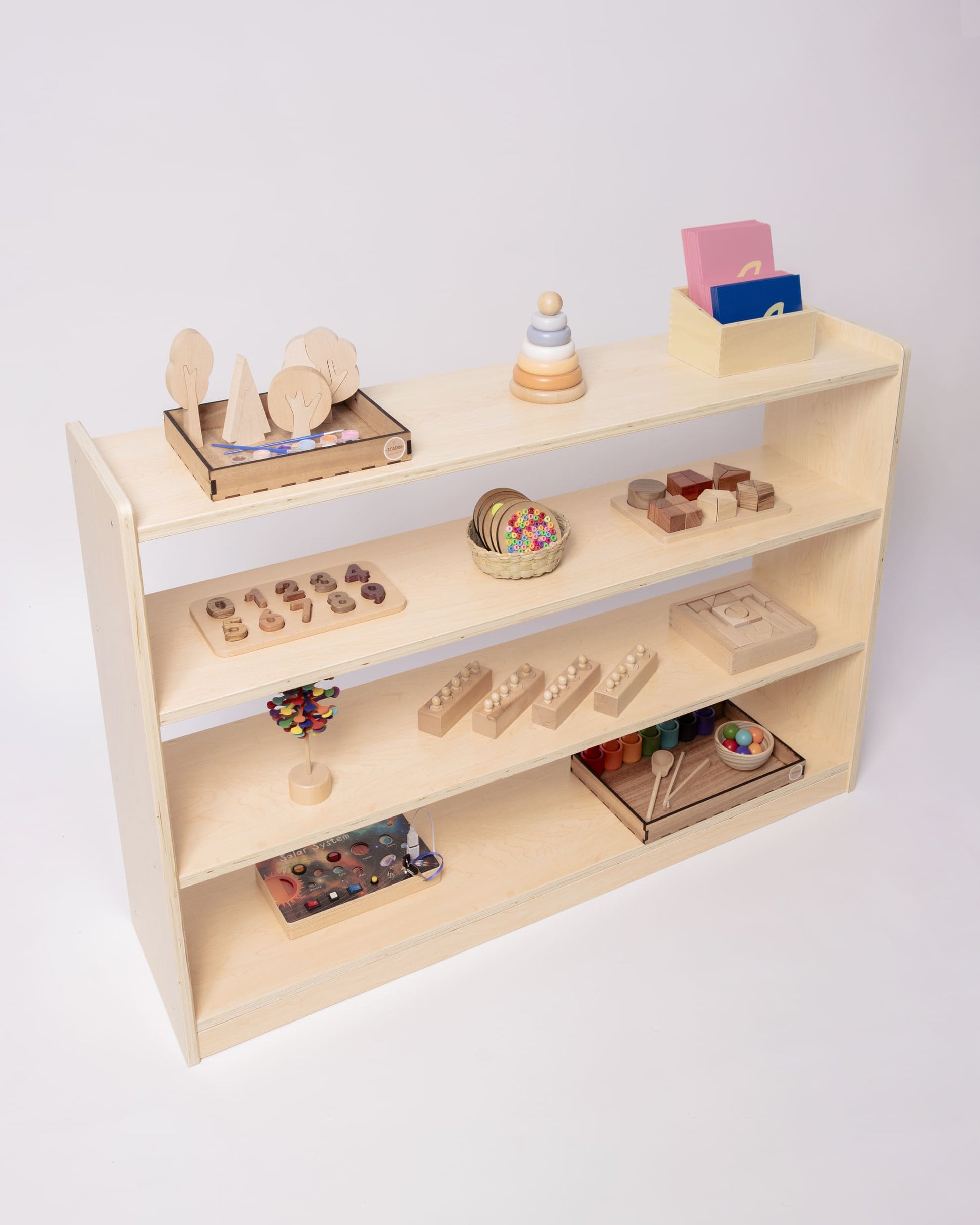 Ideal parea organizar todos tus materiales, estilo minimalista, cuidando la estética del ambiente preparado, encantando al niño para que le apetezca estar en el, visualmente el niño puedenelegir con mayor libertad que material es de su interés y rotar cada que observes que sea necesario.