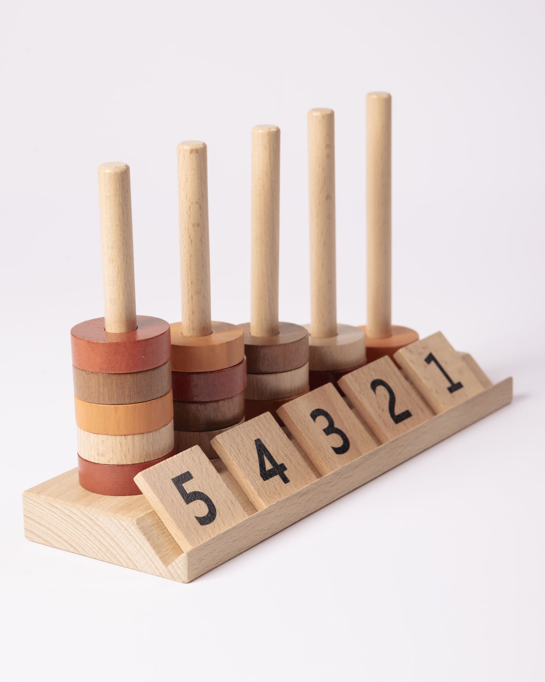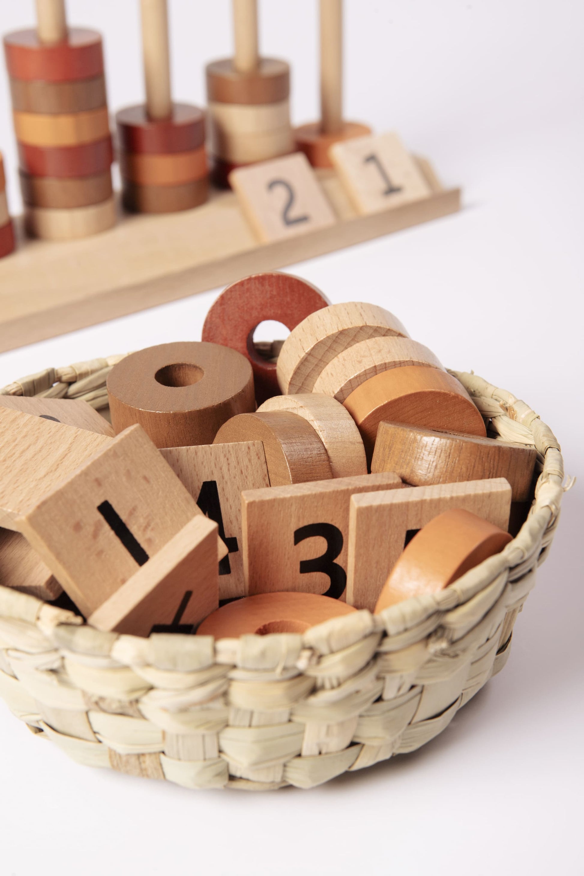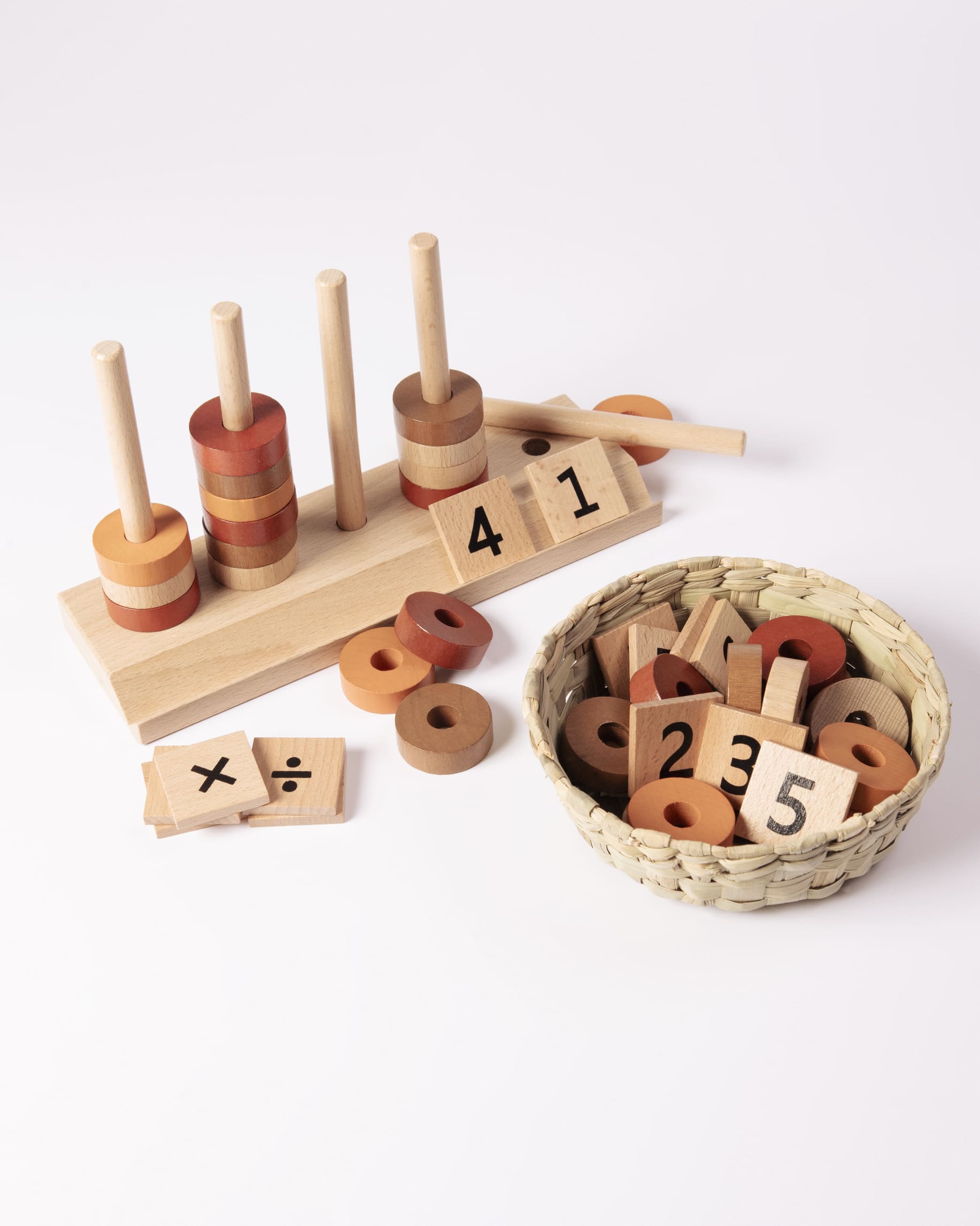 De lo SETS Favoritos en el área de desarrollo de Matemáticas, hecho de madera de pino de la mejor calidad, terminado en colores neutros, característica esencial en los materiales montessori, invitando al niño a reforzar el reconocimiento del número gráfico y de la cantidad, así comenzando con las operaciones matemáticas básicas, suma, resta, multiplicación y división.