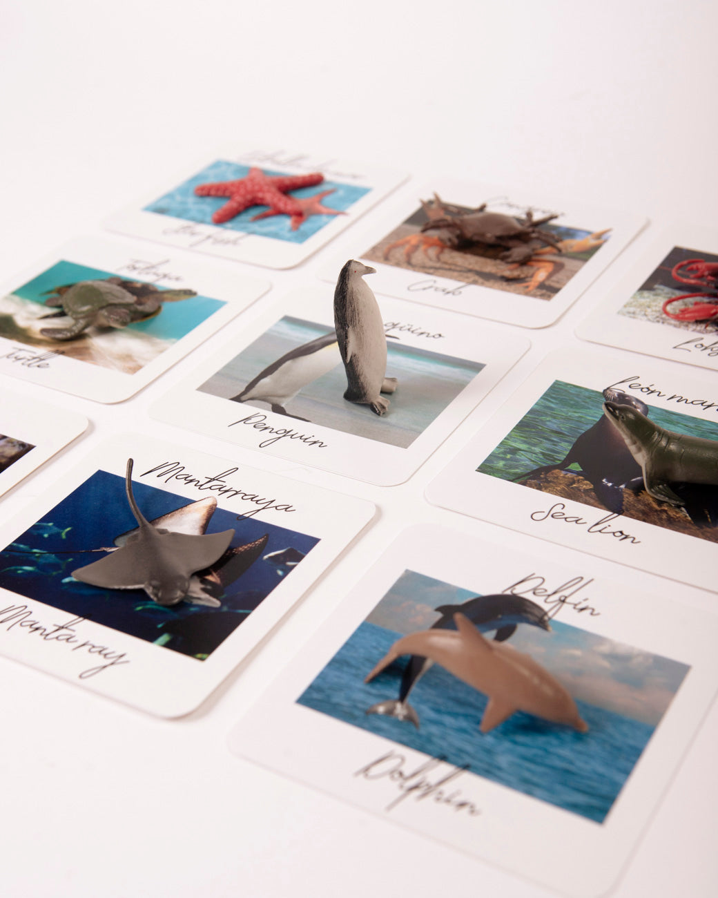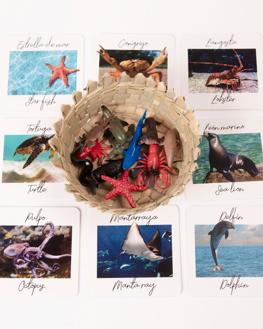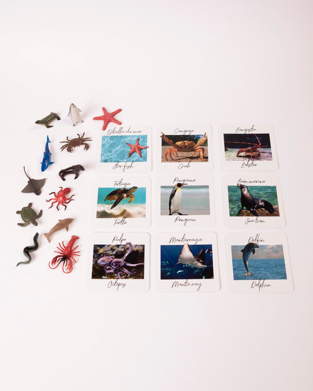 12 Piezas de animales del Mar realistas con nombre en español e inglés.