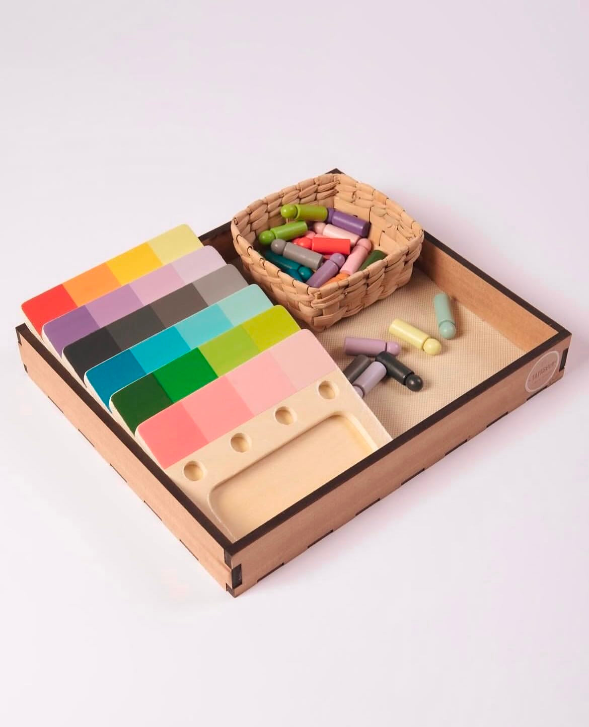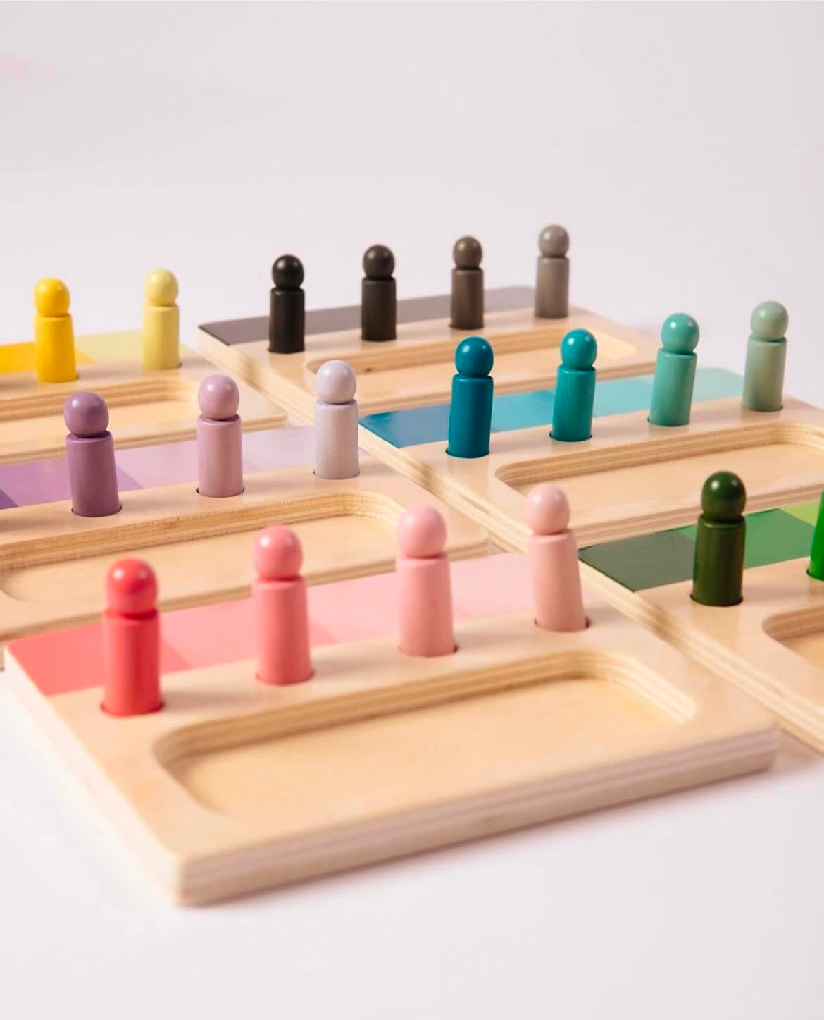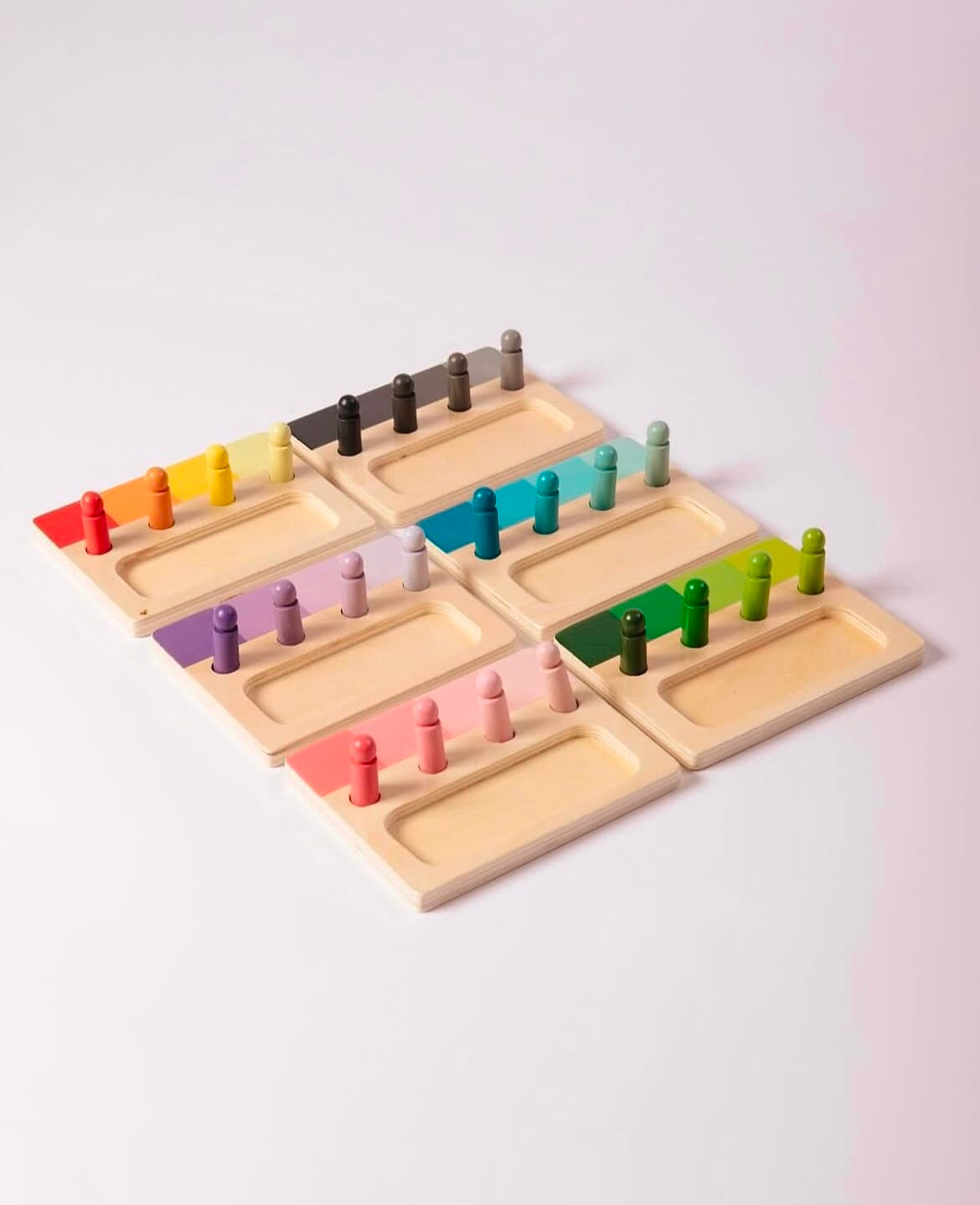 Con este material se invita al niño a distinguir la intensidad de los tonos y colocar las piezas en orden desde el mas claro al mas oscuro de cada color, así preparándose para todo tipo de observación científica y artística.